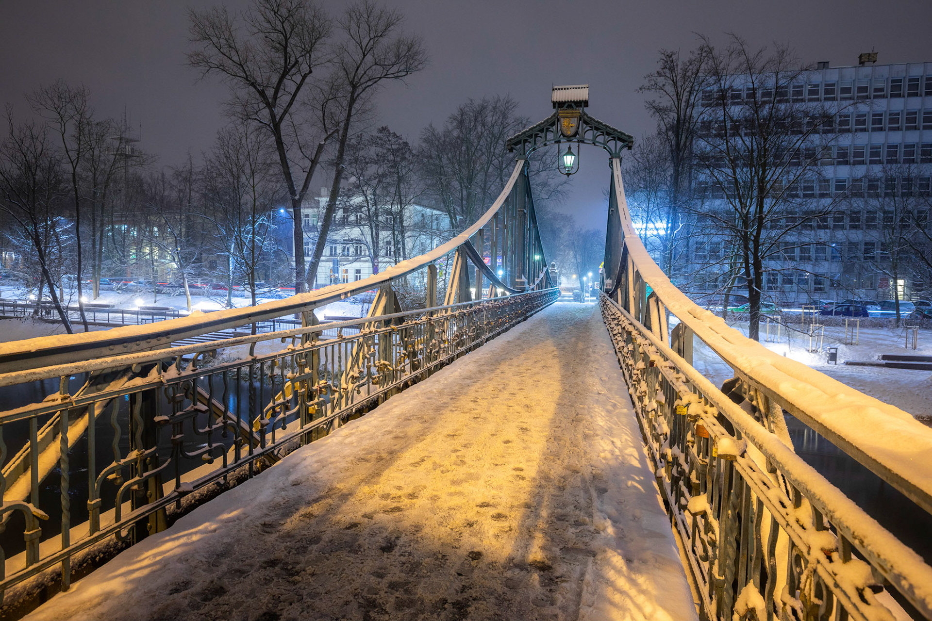 Zimowe Opole- uroczy Most Groszowy w bieli,
