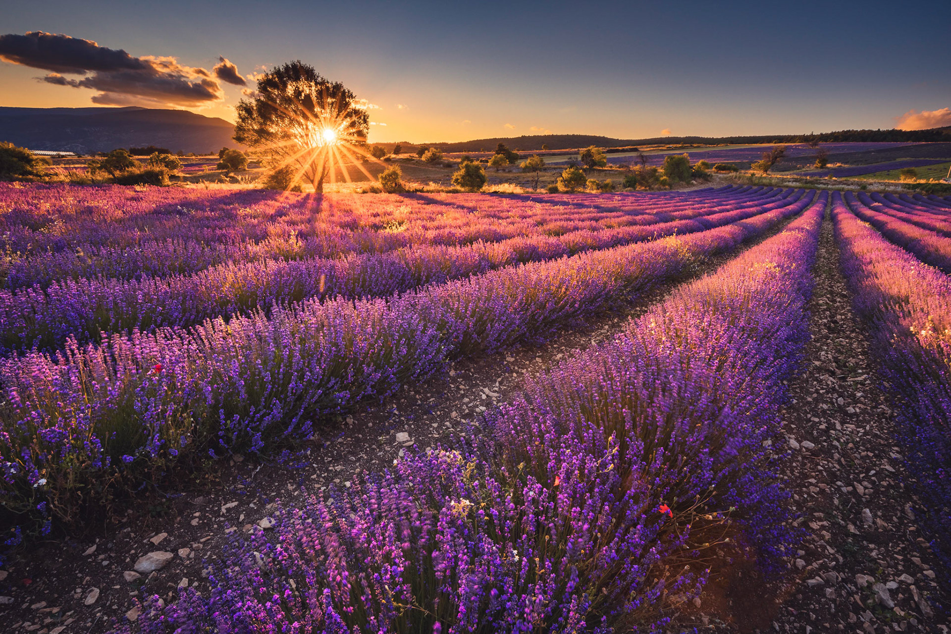 Wieczorne fotografowanie okolic Valensole – zachód słońca nad lawendowymi polami.