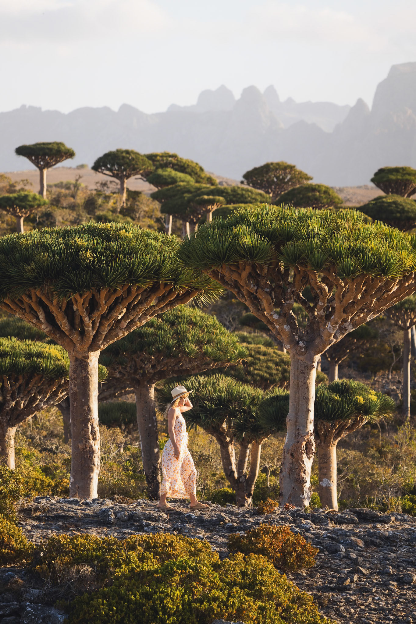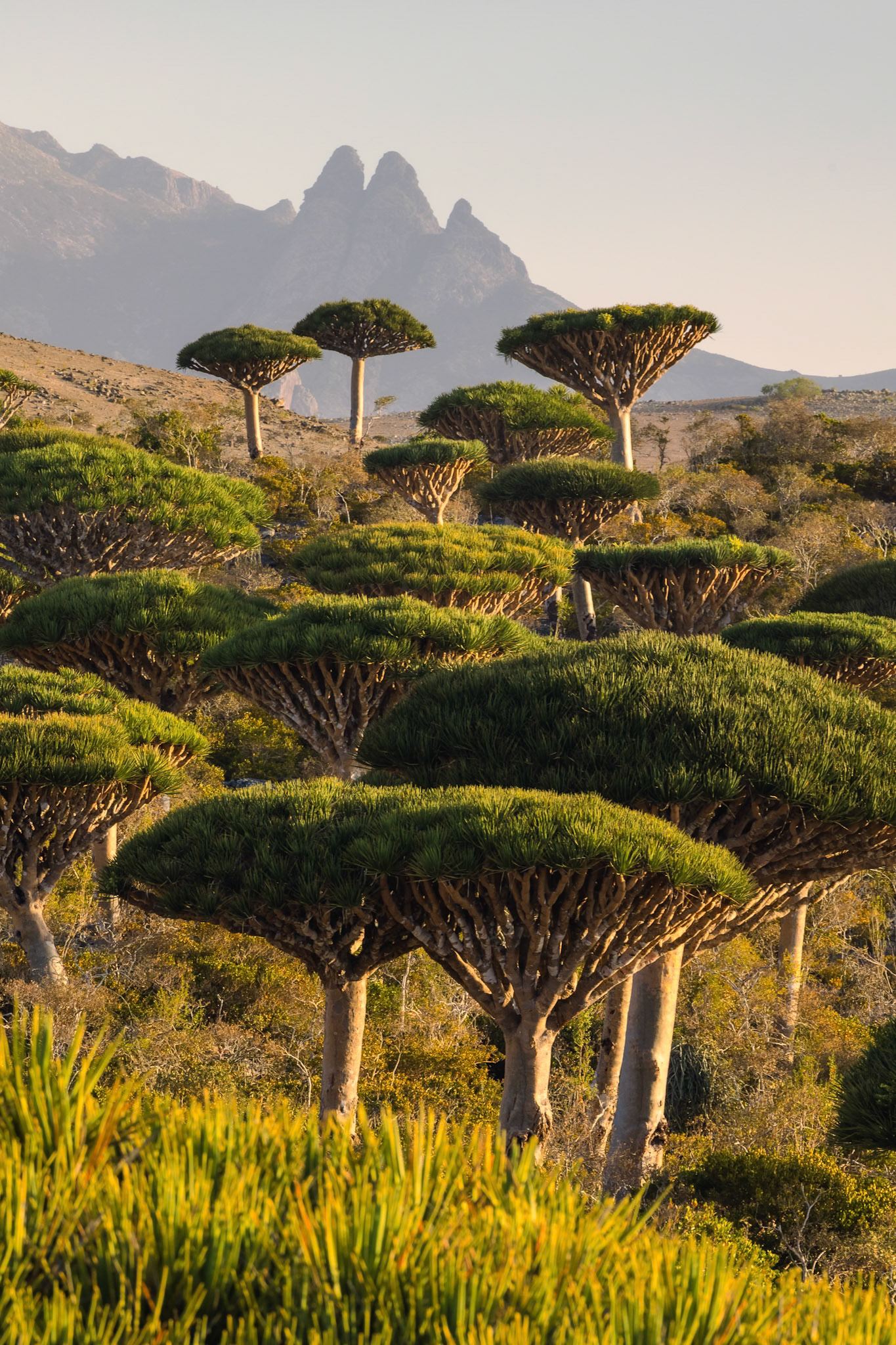 Magiczny krajobraz lasu Firhmin na Sokotrze – gęste skupisko smoczych drzew o parasolowatych koronach, rozciągających się nad skalistym płaskowyżem Dixam. Niezwykła sceneria przypomina kadr z innej planety.